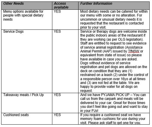 This guide has been developed to provide an explanation of the accessibility at Farmgate Restaurant. If you have any other specific needs not mentioned, please call Nicole to discuss and we will make all endeavours to meet your, and/or your guests’, needs.