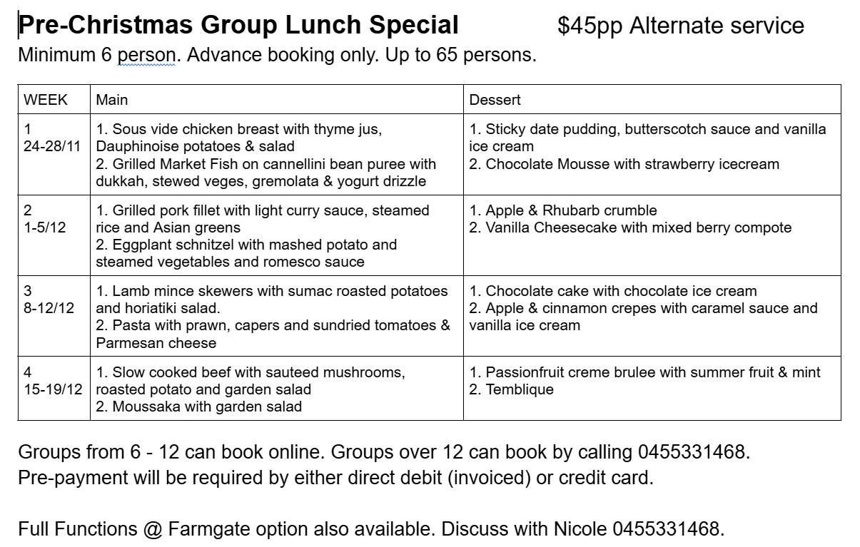 3 courses $60 – pumpkin soup + traditional Xmas Dinner + Chrissy Pud + tea or coffee